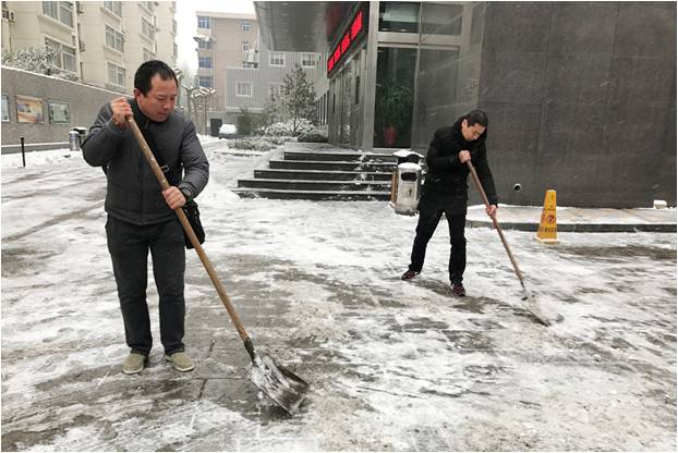 昨天開始,西安再降大雪,積雪覆蓋了公司辦公大院,為員工出行帶來了諸多不便。今天一大早,四方公司經(jīng)理沐建國同志立即組織和帶領(lǐng)部門同志對院內(nèi)積雪進行清掃,同時駕駛員趙建剛、郝穩(wěn)忠、季旺軍等同志也自覺加入其中。不一會兒,地下空間所郭茜彥、唐哲、甄俊田也紛紛拿起鐵鍬和掃帚,自愿加入到積雪清掃中。他們手被凍得通紅,褲子都被打濕了,也絲毫不在意。經(jīng)過大家的共同努力,保證了大家的安全出行。