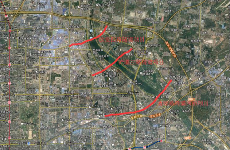 我公司承擔的西安浐灞生態(tài)區(qū)規(guī)劃區(qū)域“一橋兩隧”項目修建性詳細規(guī)劃方案設計,設計內容包括:錦堤六路、歐亞四路穿灞河隧道工程項目(隧道約1886-2596m);錦堤三路、浐灞三路穿灞河、浐河隧道工程項目(隧道約2194m);通塬路跨灞河橋工程項目(橋梁約820m)。工程總投資約26億元。