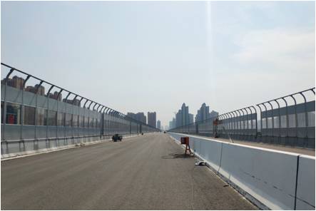 在后期施工配合中,項(xiàng)目設(shè)計(jì)組成員積極主動(dòng)為建設(shè)方與施工單位提供服務(wù),解決施工中遇到的技術(shù)難題,受到了建設(shè)方與施工單位的一致認(rèn)可。在昆明路西段即將建成之際,我公司一分院項(xiàng)目設(shè)計(jì)組成員主動(dòng)赴現(xiàn)場(chǎng)回訪,協(xié)助施工單位解決鋪裝、護(hù)欄安裝、聲屏障安裝過程中遇到的問題,為昆明路東段后續(xù)施工提供技術(shù)支持與服務(wù),同時(shí)也為我公司承攬此類項(xiàng)目積累寶貴經(jīng)驗(yàn)。