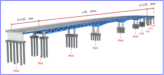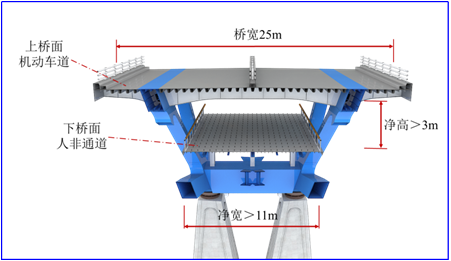 香槐六路跨灞河橋工程位于灞河隴海鐵路大橋下游至灞橋區(qū)、浐灞生態(tài)園區(qū)交界處,距北三環(huán)橋約700m,西起歐亞六路,東接香槐六路,全長(zhǎng)732m,為特大型橋梁。其中主橋總長(zhǎng)495m,采用六跨57.5+71+120+120+70+57.5m變高連續(xù)鋼桁梁結(jié)構(gòu),引橋及引道長(zhǎng)237m。橋梁采用雙層橋面,上層橋面為機(jī)動(dòng)車(chē)道,寬25m,下層橋面為人行通道,寬11m。其主跨120m跨度及充分利用鋼桁梁結(jié)構(gòu)特點(diǎn),采用了人、車(chē)分離式雙層橋面布局,均屬灞河上同類(lèi)橋梁的首創(chuàng)。