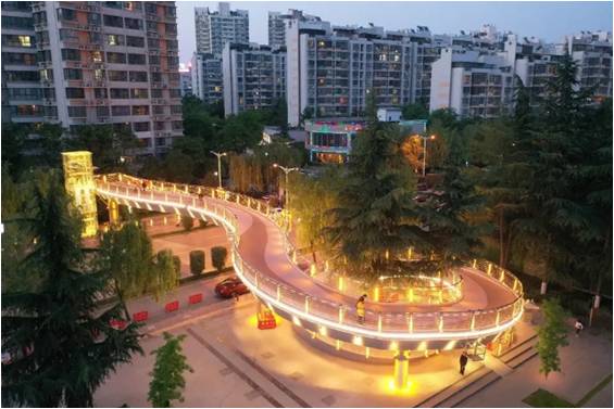 木塔寺人行天橋?yàn)楦咝聟^(qū)首個(gè)加裝無障礙垂直電梯的天橋。電梯外觀采用漢唐風(fēng)格的玻璃剪影,與木塔寺公園相呼應(yīng)。橋梁欄桿及立柱采用內(nèi)嵌洗墻燈,梁底采用小投光燈,橋墩采用雙頭壁燈整體打亮,勾勒出橋梁整體線型;并采用暖白光與黃光相結(jié)合,營(yíng)造低調(diào)而又典雅的氛圍,夜景照明效果通透大氣。