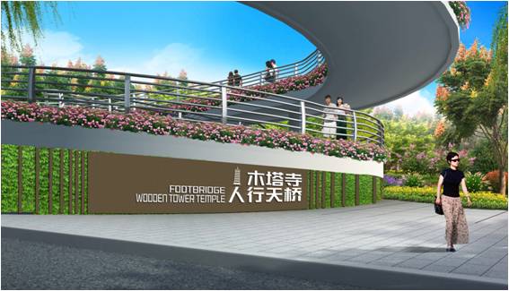 木塔寺人行天橋景觀利用現(xiàn)狀雪松營(yíng)造局部休憩小空間,地面延用周邊鋪裝,并用深色條帶鋪裝進(jìn)行分割,體現(xiàn)鋪裝的變換形式,同時(shí)采用蓮花造型的地面浮雕作為裝飾,彰顯木塔寺的文化氣息。人行天橋標(biāo)識(shí)牌整體設(shè)計(jì)簡(jiǎn)潔大氣,采用中英文標(biāo)識(shí)以及木塔寺造型logo,體現(xiàn)其獨(dú)特性。標(biāo)牌鏤空處采用立體綠化,與橋體統(tǒng)一協(xié)調(diào),既起到了標(biāo)識(shí)作用,又提升了可觀賞性。