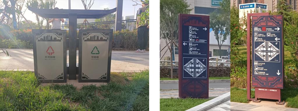 我公司設(shè)計(jì)人員在兩期設(shè)計(jì)作品中深入挖掘西安市本土元素,與現(xiàn)代設(shè)計(jì)手法相結(jié)合,在充分滿足上位規(guī)劃對(duì)防護(hù)綠地用地性質(zhì)規(guī)劃條件的同時(shí),大膽創(chuàng)新引入附屬綠地用地性質(zhì)中的休憩配套功能,因地制宜打造海綿城市系統(tǒng),形成綠色低碳循環(huán)發(fā)展體系。
