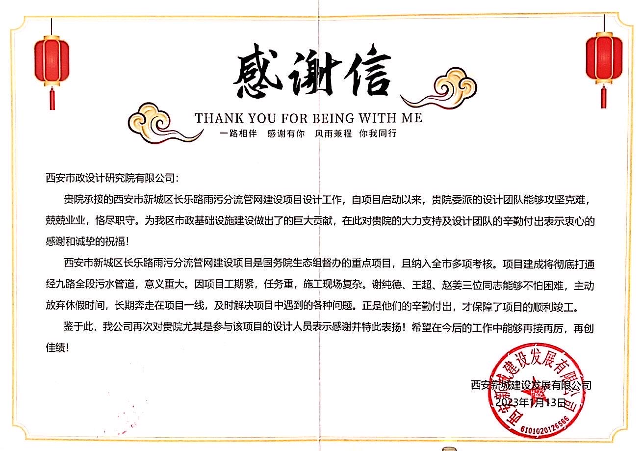 近日,科源公司收到一封來自西安新城建設(shè)發(fā)展有限公司的感謝信,對科源公司在新城區(qū)長樂路雨污分流管網(wǎng)建設(shè)項(xiàng)目中的設(shè)計(jì)工作給予充分肯定,同時(shí)對項(xiàng)目組成員的辛勤付出表示感謝。
