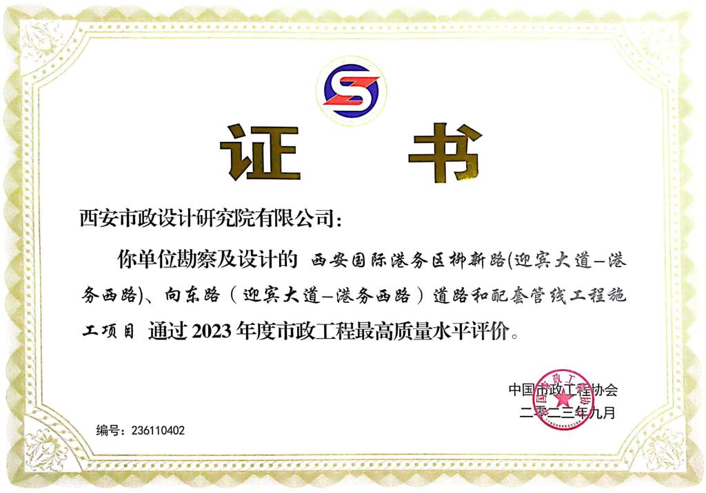 近日,中國(guó)市政工程協(xié)會(huì)頒發(fā)了2023年度市政工程最高質(zhì)量水平評(píng)價(jià)榮譽(yù)證書,我公司勘察設(shè)計(jì)的“西安國(guó)際港務(wù)區(qū)柳新路(迎賓大道-港務(wù)西路)、向東路(迎賓大道-港務(wù)西路)道路和配套管線工程”、“雁翔路及新安路市政工程”獲此殊榮。