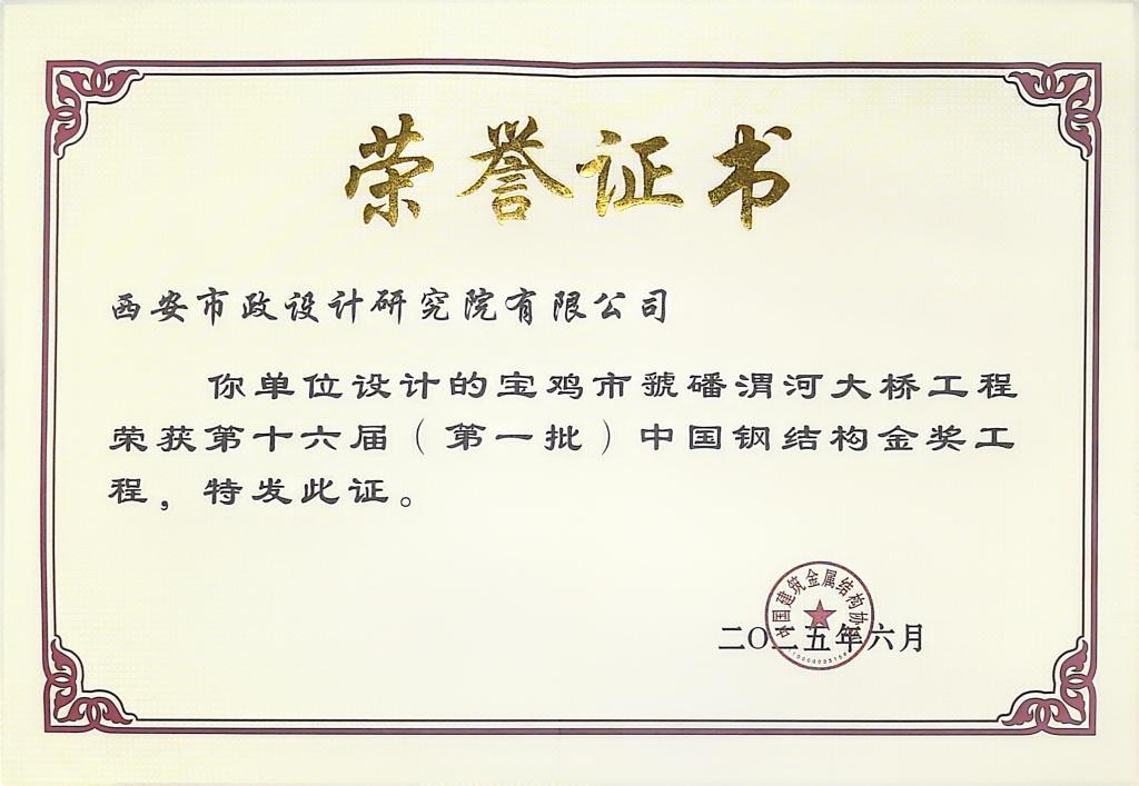 近日,中國建筑金屬結(jié)構(gòu)協(xié)會頒發(fā)了第十六屆第一批“中國鋼結(jié)構(gòu)金獎”榮譽(yù)證書,由我公司承擔(dān)設(shè)計的寶雞市虢磻渭河大橋工程獲此殊榮。